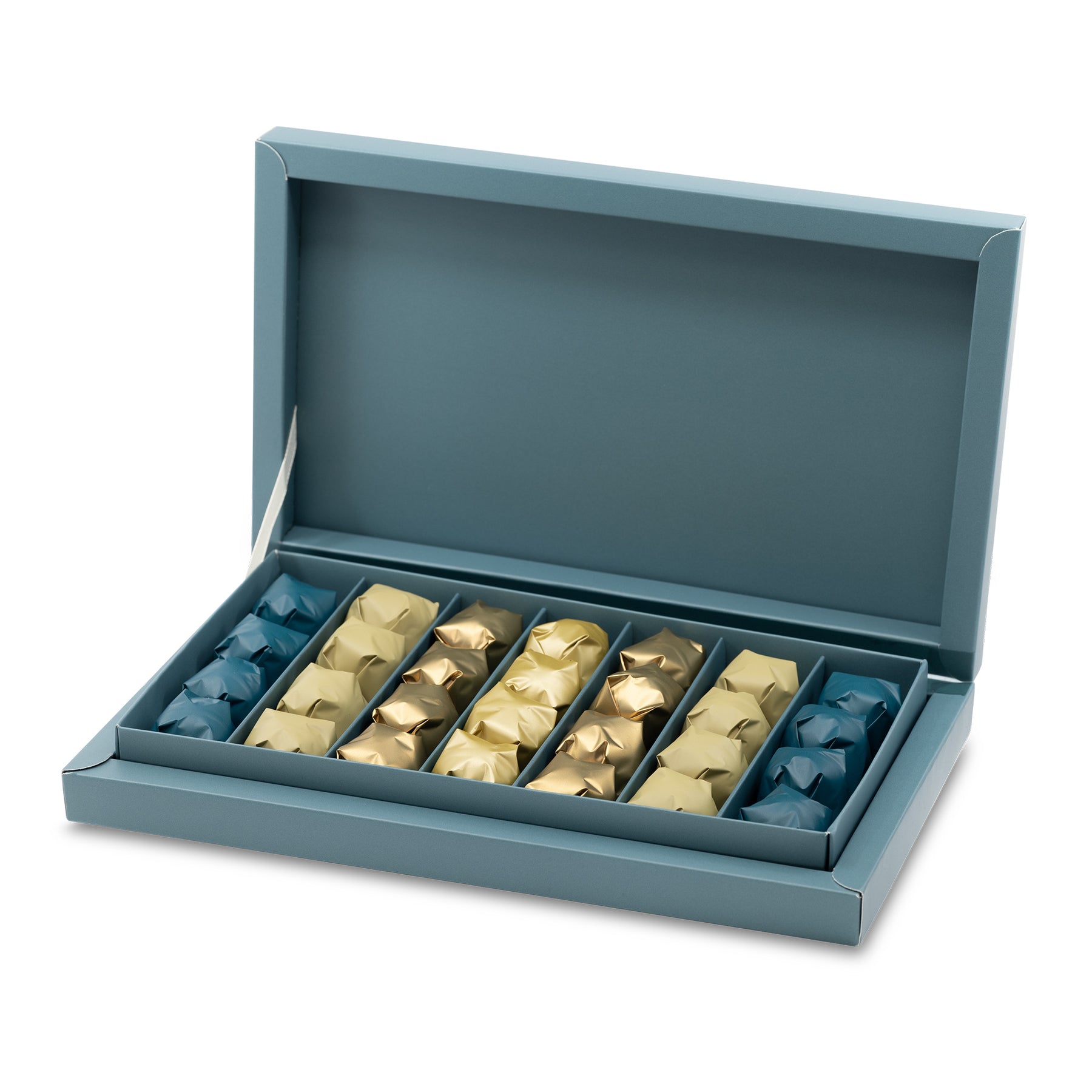 A quaint assortment of 28 of our surprising chocolate coated and flavor filed crunchy truffles. Unique to this box flavors include, include chocolate ganache, mocha ganache, hazelnut butter and, crepe filled ganache.