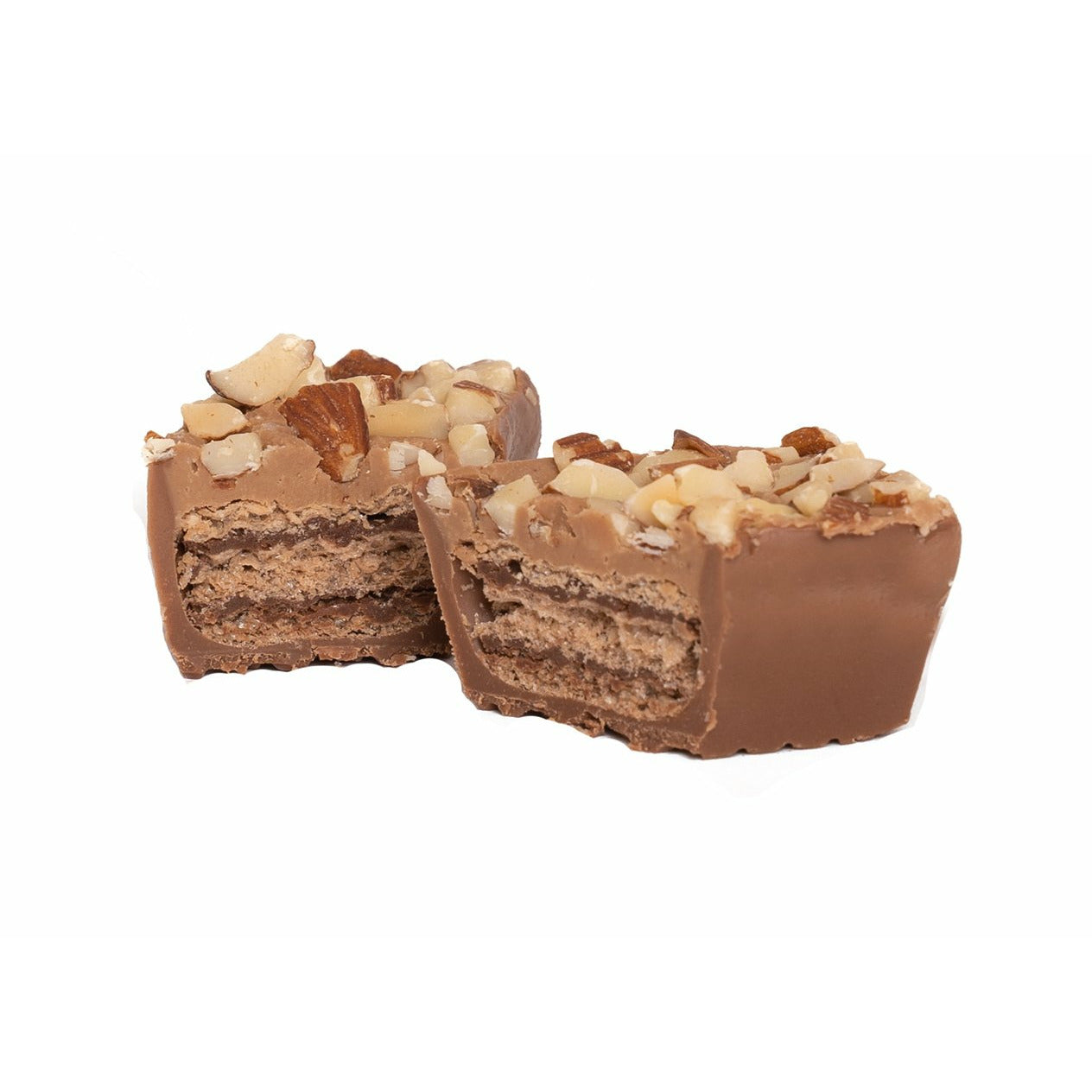 A delectable milk chocolate praline layered under a bed of peanut butter with chopped almonds sprinkled atop of the crunchy flavorsome biscuit.