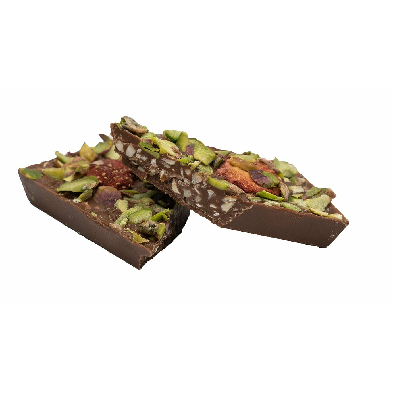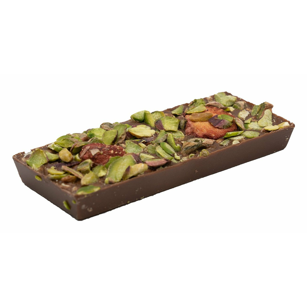 Dried fruit lovers will be delighted to try our milk chocolate bar covered in yummy strawberries and chopped pistachios.