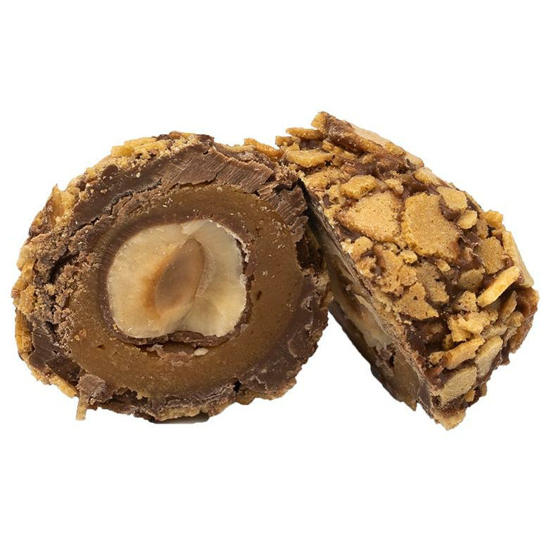 What do you get when you combine hazelnut, caramel, and feuilletine all in one exquisite treat? Well the picture already speaks for itself. This round confection is sprinkled with feuilletine all around and contains a caramel and hazelnut filling that will win your heart over.