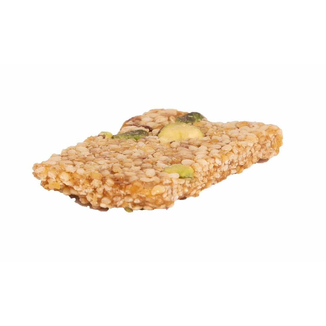 Inviting square brittle sprinkled with flavorful and crunchy pistachio shreds. These savory confections are sure to please all brittle lovers in your life.